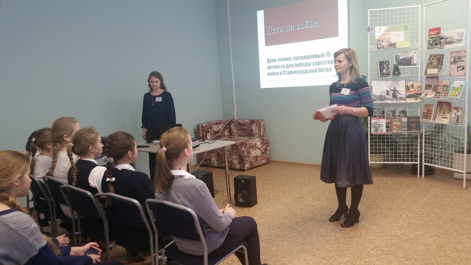 8 февраля в детской библиотеке № 206 им. И. Е. Забелина прошел День чтения к 75-летию Сталинградской битвы Великой Отечественной войны, участниками которого стали учащиеся 5-го «А» класса ГБОУ Школа № 712 . Тема мероприятия – «Юные герои Сталинграда» была раскрыта через повесть Владимира Шмерлинга «Дети Ивана Соколова» и рассказ Сергея Алексеева «Геннадий Сталинградович».